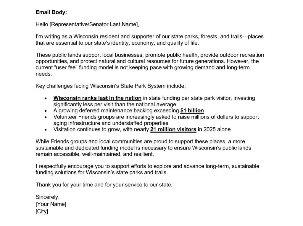 We encourage you to contact your representatives and let them know as a Wisconsin resident, you support our state parks, forests, and trails — places that are essential to our state’s identity, economy, and quality of life.